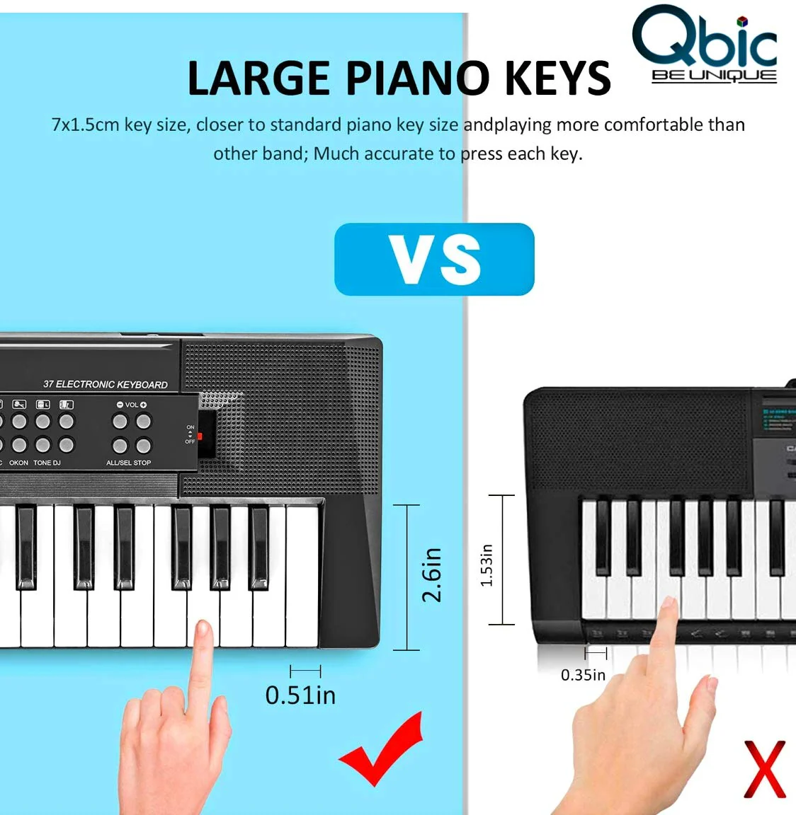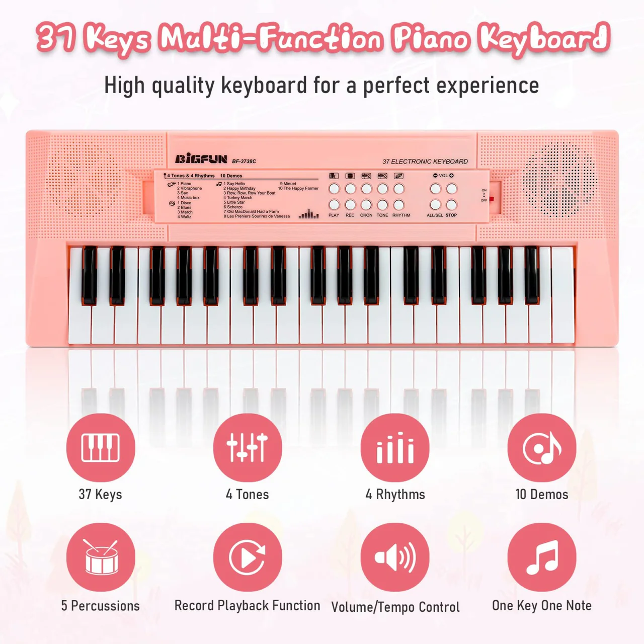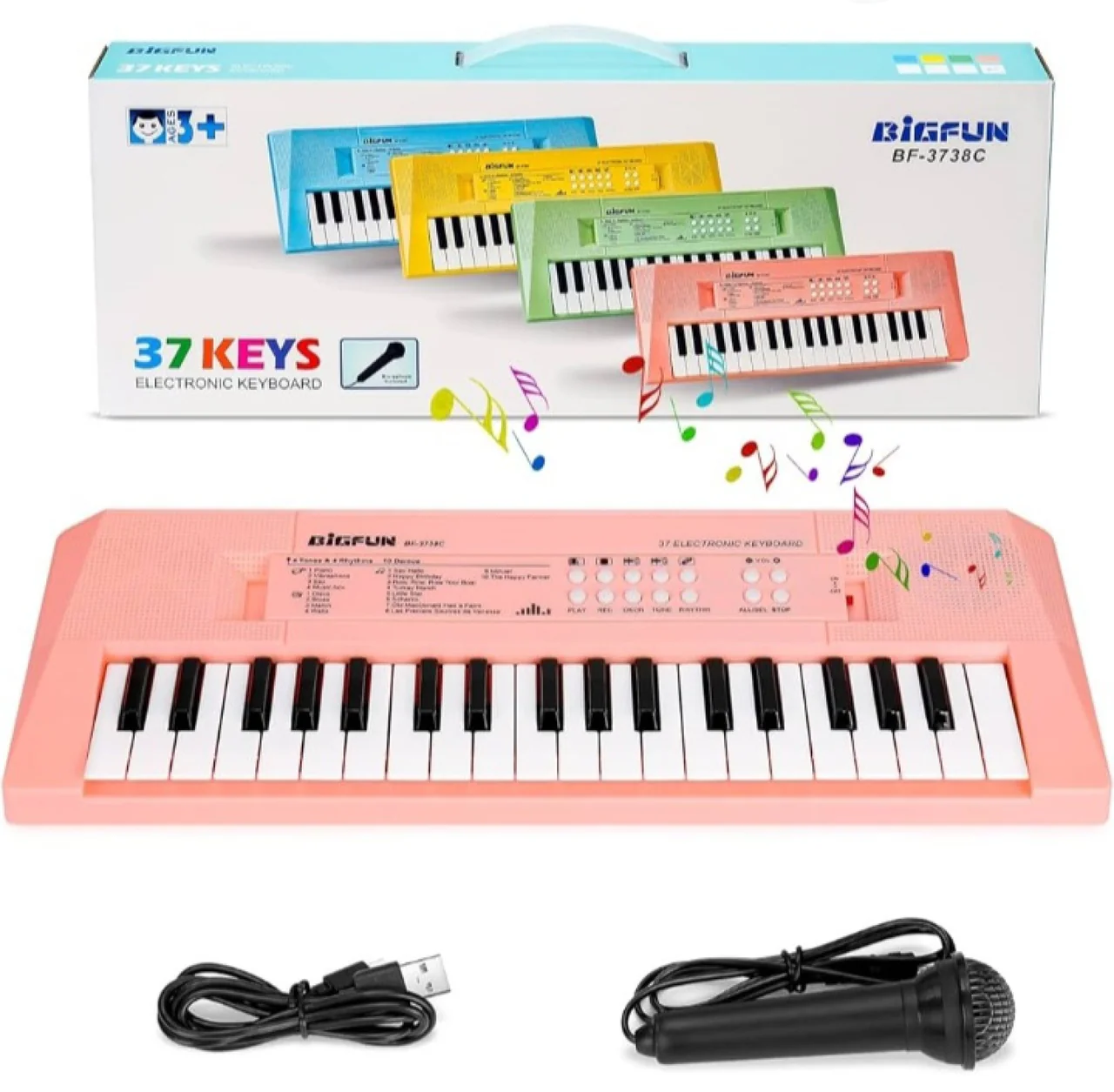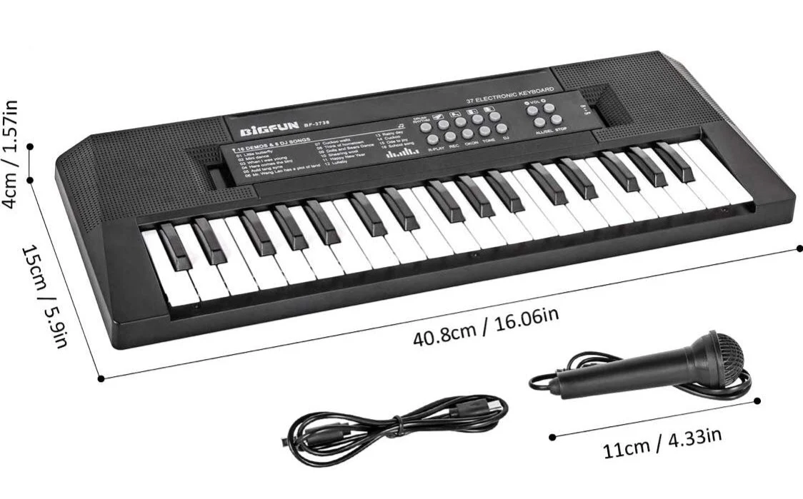 • 37-note electronic keyboard featuring 16 built-in demonstration tracks, 8 DJ-style compositions, dual sound options, and 4 rhythm patterns