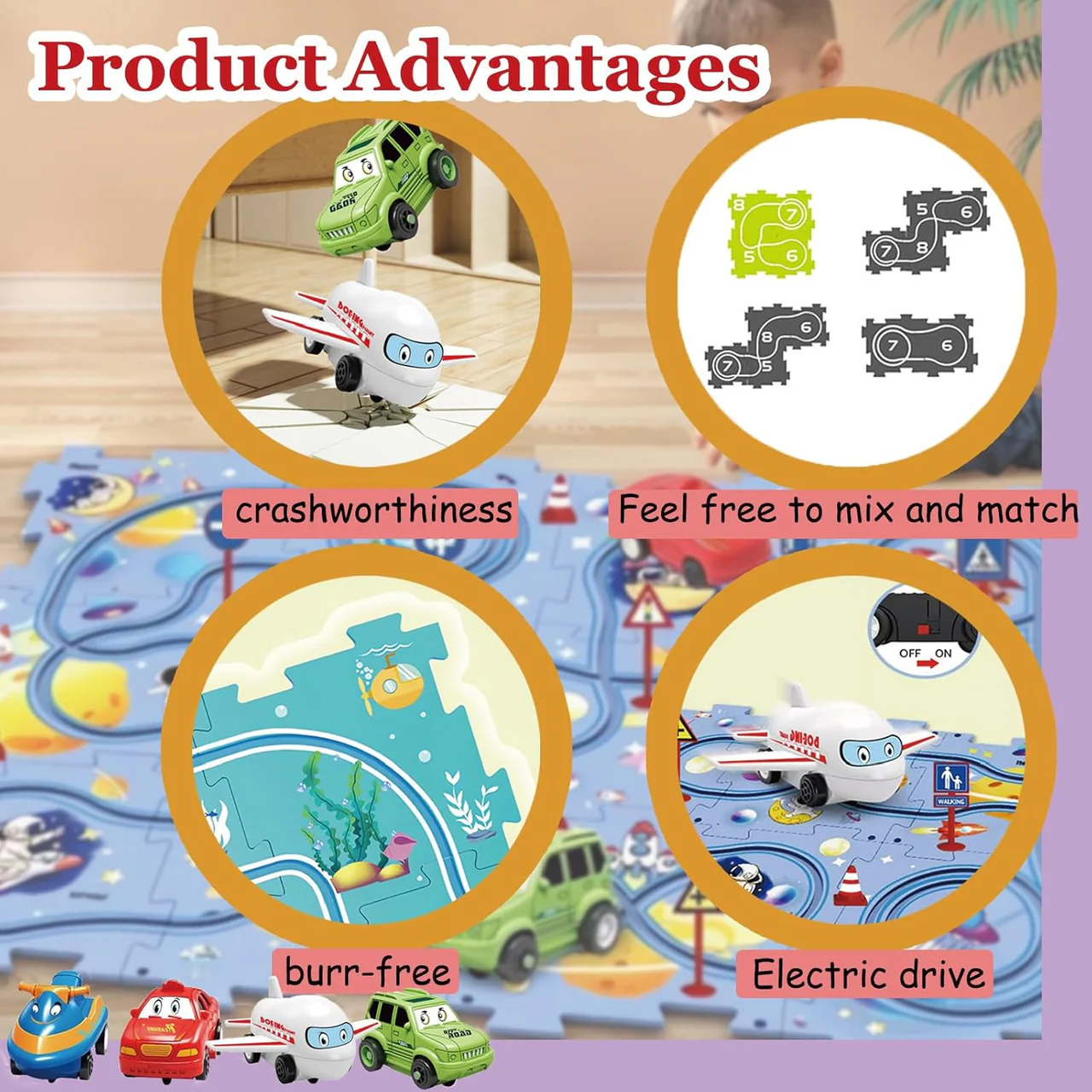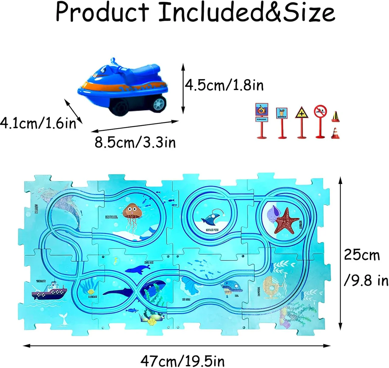 - 【Puzzle Racer Kids Car Track Set】 – This set includes 12 puzzle pieces, 12 road signs, and 1 battery-operated car for endless fun and creativity.
